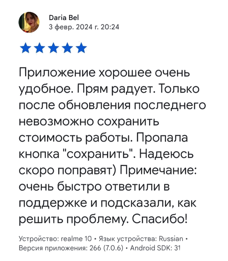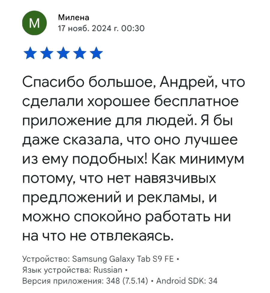 Я тружусь в статусе самозанятого и в первую очередь делал приложение для себя. За годы его публикации я получал множество предложений по его улучшению и добавлению новых функций. Приложение сейчас такое, как оно есть во многом благодаря моим пользователям. Спасибо им за это!