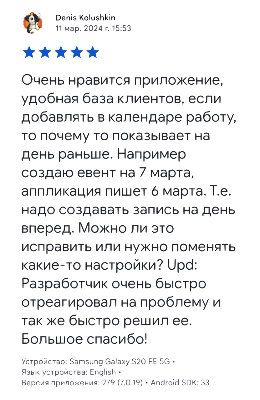 Так же в приложении есть статистика по месяцам и т. д., что позволяет его использовать, как бизнес инструмент. Удобный календарь и все параметры приложения можно настраивать под себя. И что очень важно разработчик приложения всегда на связи. Спасибо