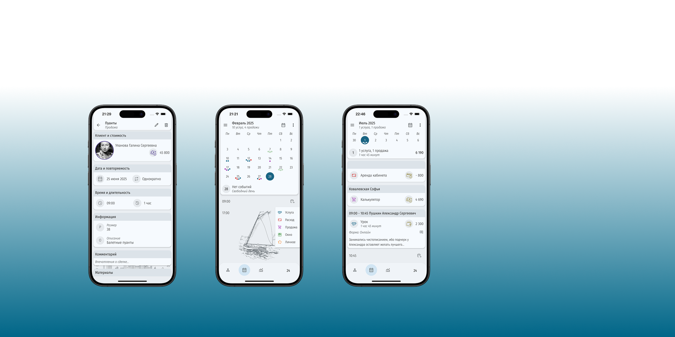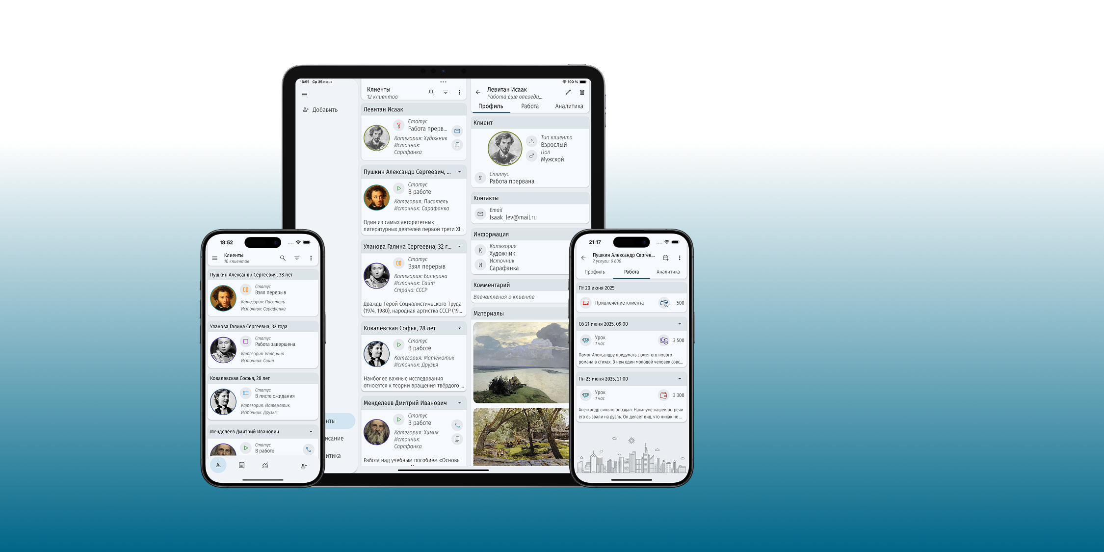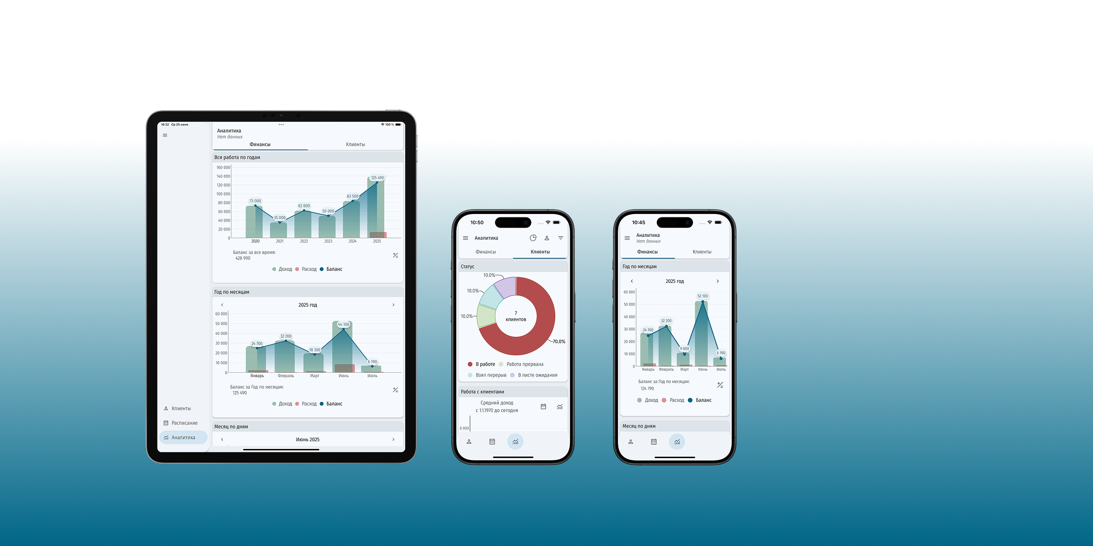 Приложение создано для самозанятых и малого бизнеса. Оно помогает вести учёт клиентов, управлять расписанием, контролировать финансы и анализировать данные.